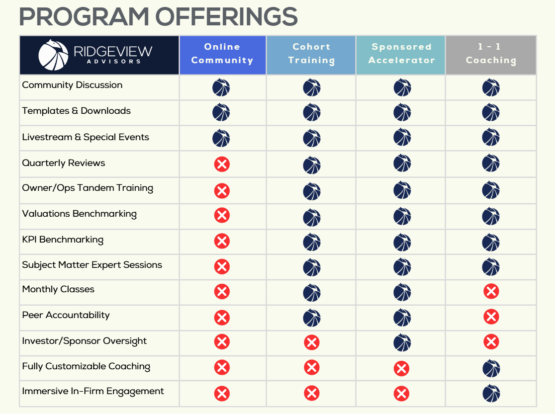 Monthly training and coaching for 2 executive seats, access to online community, templates & forms, monthly office hours with experienced coaches, Valuation as a Service to track core financial KPIs monthly.